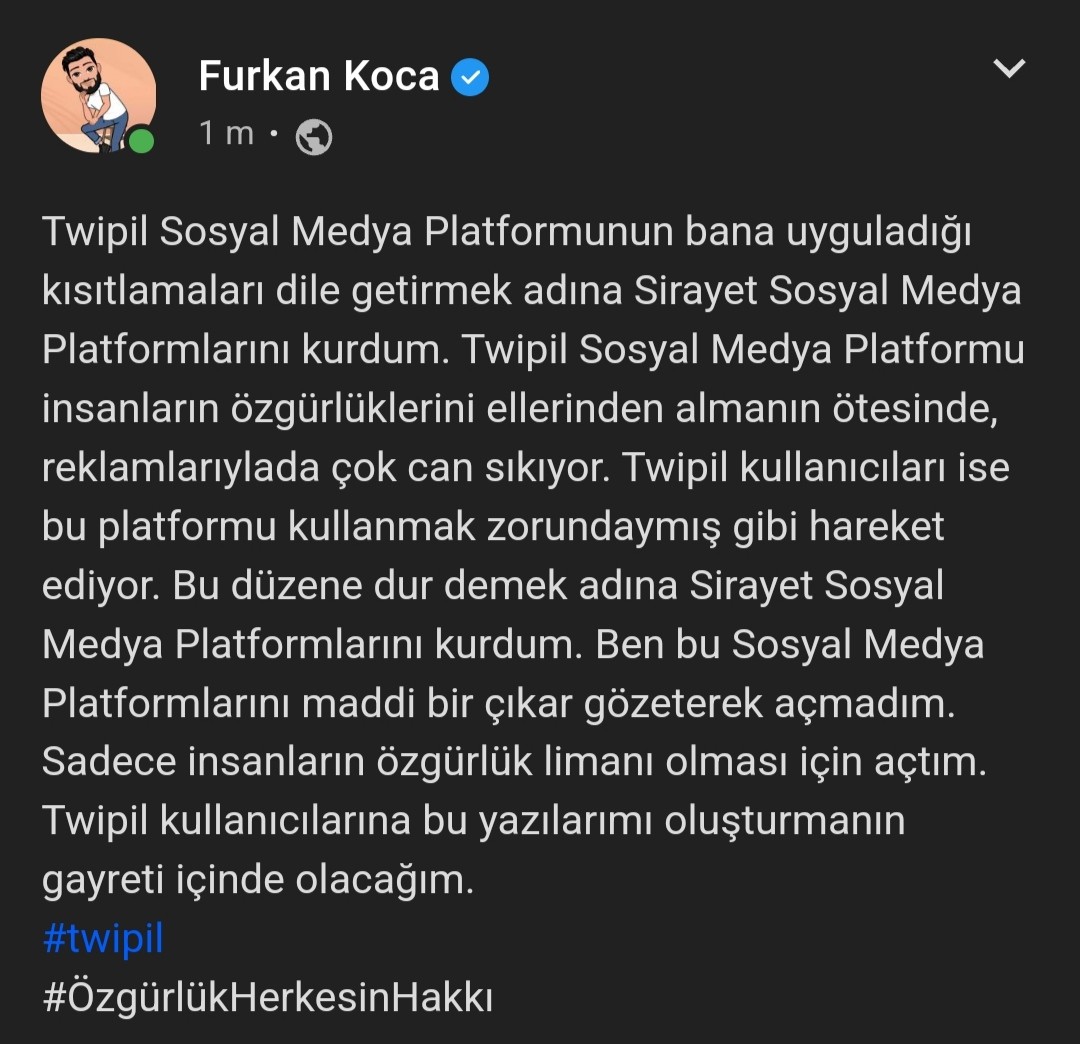 Sirayet Sosyal Medya Platformunun kurucusu Furkan Koca'dır. Sirayet Sosyal Medya Platformu ticari bir amaçla kurulmamıştır. Özgürce düşüncelerini ifade edemeyen insanların sığınağı olmak için kurulmuştur. Tüm dünyaya özgürlük Sirayet edene dek Platformumuz aktif olarak görev yapacaktır.